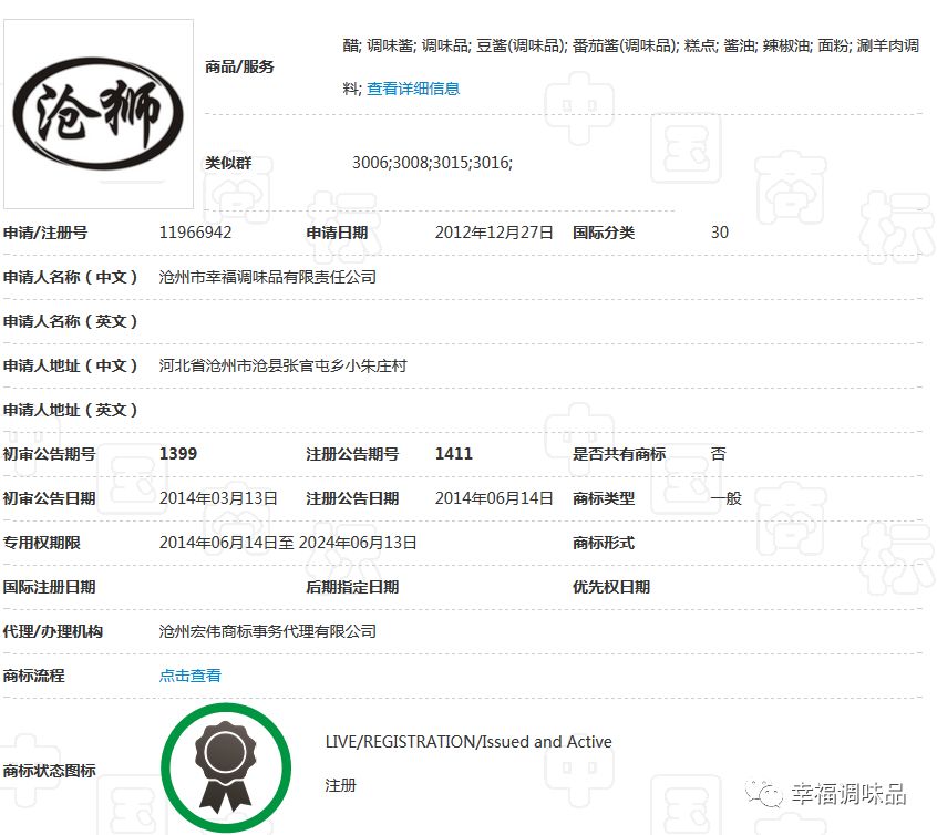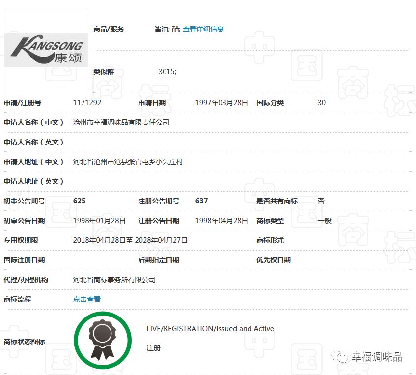 幸福調(diào)味品自創(chuàng)辦30多年以來,在工商部門指導下,充分認識到商標品牌的重要性,始終堅持走創(chuàng)品牌的路子。公司的“康頌”商標于1997年在30類,糖、茶、糕點、調(diào)味品類獲核準注冊后,并根據(jù)市場需要,先后又注冊了包括“滄獅”中文及拼音在內(nèi)的等商標;形成了涵蓋多類別、多商品、多層次的商標品牌庫。