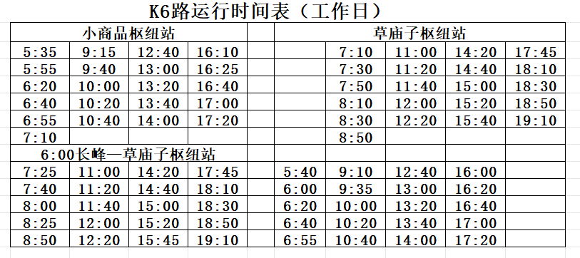 運(yùn)行時間:長峰(中諾口腔)6:40、17:08;草廟子樞紐站6:52、7:27、18:00;K6路工作日運(yùn)行計(jì)劃同時優(yōu)化調(diào)整(詳見附件)。